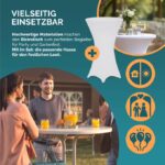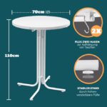 Zusätzlich befinden sich am Bartisch 2 Haken, an denen Taschen oder Jacken aufhängt werden können. Das Set ist leicht zu reinigen und kann platzsparend verstaut werden, die Tischplatte lässt sich einfach herunterklappen. Perfekt für private Feiern, Hochzeiten und andere Events!